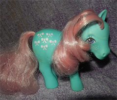 Her issue, like Applejack's was complicated. Initially she was sold everywhere in the same style -the shy pose as shown above, with silky straight hair. Then, when she and Applejack were re-released as part of the next set of Earth Ponies, there was a parting of the ways. In the US and Canada, she retained her shy pose, inheriting curly hair (a new gimmick for that year). But in the UK release (coined by Hasbro in their list as "Groom and Style" ponies) she changed poses. This time she was made in the pose given to the original six My Little Ponies. She did, however, get the curly hair that the US release also had (giving her a longer hair look when found with the curls dropped out).