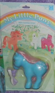 The Collector Pose version of Bow Tie did get another release, although the circumstances surrounding it are a little confusing. In German speaking countries, she was apparently released as part of the 1986 set (on a card on which she is neither named nor pictured). As far as I know, although the same style of card was used in the UK for the 1986 My Little Pony collection, Bow Tie was NOT sold on this card in the UK.