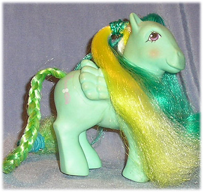Green pegasus pony with dark green, pale pink, yellow and white mane and tail, purple braid with white tie symbol