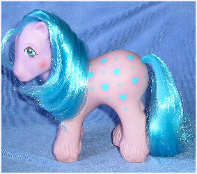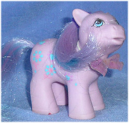I believe that the North American release of the families also issued them in complete sets, whereas in the United Kingdom release, they were initially put out as seperate ponies. In their second year of issue, the families were sold together in 'gift sets'. None of the ponies really had much in the way of accessories - the adults had a hairbrush and ribbon and the babies either a coloured bow-tie (for the boys, as pictured on Baby Brother, above) or an 'I Luv You' hair clip (for the girls). Some were also sold during the Mummy Charm offer, meaning that there was often a second little friend hiding within the packages.