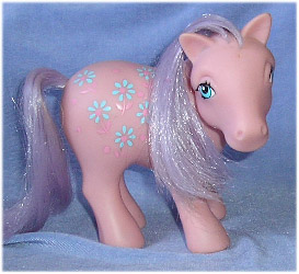 MUMMY: Pinkish purple earth pony with lavender mane and tail, blue and pink flowers symbol across body.