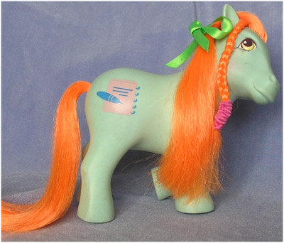 Aqua earth pony with bright orange mane and tail, pink notebook and blue pen symbol