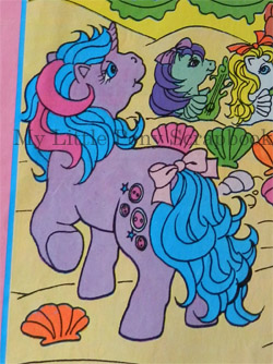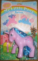 Classic Buttons, as shown above, is also the one pictured in the MIP image. She has the small pink buttons and stars with which Buttons was always illustrated and animated in all pony merchandise and television extravaganzas. There is a single exception to this rule - she is pictured on the back of the set's card with the other symbol variation -three big buttons. Though the three big buttons version seems to be harder to find, the classical Buttons appears to be more popular with collectors. Ironically, too, Baby Buttons (sold only in Germanic countries) had the classical symbol. Buttons was also shown with the classical symbol in the comic.