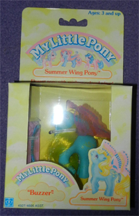 Buzzer, logically, was connected with the bees in Ponyland - much as Honeycomb had been before her. Because of her vibrant colours, she's the Summer Wing Pony most like the 1989 Windy Wing set -though her insect symbol proves where she really belongs. She made occasional comic appearances - I remember one occasion where Speedy and Trucker were travelling through ponyland and they paid a visit to the Summer Wing Ponies in their little vale!