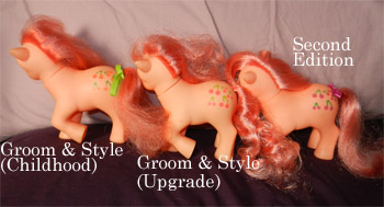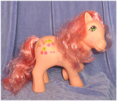 Her Groom and Style (1985, original) edition is distinctive because of the naturally curly hair. Even those Cherries Jubilees who have lost their original curl tend to have very long, roughish hair and these are identifiable as original set Cherries Jubilees. In North America, this set of ponies are simply known as Year 3 Earth Ponies.