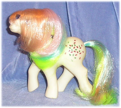 "Wedding Bells" Confetti was made in the Bow Tie "shy" pose, and dressed out in her finest white dress, with veil, white shoes, ring and lacy garter to show that it was her special day. It seems not to have been important to Hasbro that, as yet, they had not bothered to release an adult boy pony (and indeed, Confetti never would have a groom. Poor girl!) She was sold as part of the 1986 UK line. I am unsure what other parts of Europe she was sold in but have definitely seen her mint in French box, so it seems probable she did a general sweep of much of Western Europe. Almost certainly she was sold in Scandinavia, where many UK boxed ponies were sold (in English).