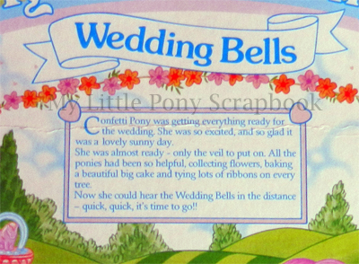 The backcard story for the set implied that Confetti was the bride herself, however. The fact there were no adult boy ponies around in ponyland at the time doesn't seem to have bothered Hasbro's design team or creative process one bit, but the comic people apparently gave it a bit more reasoned thought! The box does also imply that her full name was "Confetti Pony", but I guess marriage changed all that, as she was only ever known in the comics by the name "Confetti". It is interesting to note that there is no "tm" sign by Confetti's name on her UK box.