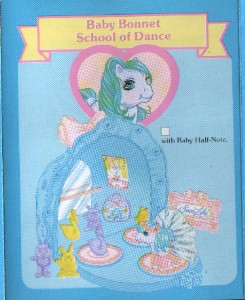As the name suggests, the playset was shaped like a bonnet. When opened out, it revealed a mirror (with a barre across it - my picture above does not show the barre, as I've misplaced it, but it came in either pink or yellow and slotted into small holes on either side of the mirror. You can see it illustrated in the insert below). THe floor at the front had three wheels on which the baby ponies could stand and be turned to "twirl". The mechanism to do this was on the side, and all three wheels turned at once. Baby Half Note came kitted out in her dance outfit, with a dance case (this could be pink or yellow) and a series of signs to announce today's dance show. The Dance School made an energetic showing in the My Little Pony movie.