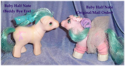 The above insertpicture is from 1987-8 and appears to show Beddy Bye Eye Baby Half Note. In North America, it seems to have been more commonly (if not exclusively) the Beddy Bye Eye Baby sold with the playset. The Original version was sold through Mail Order at a later date. The Beddy Bye Eye one was offered through a mail in offer in the UK in around 1989, suggesting she was the later release of the two here, but it is not clear.