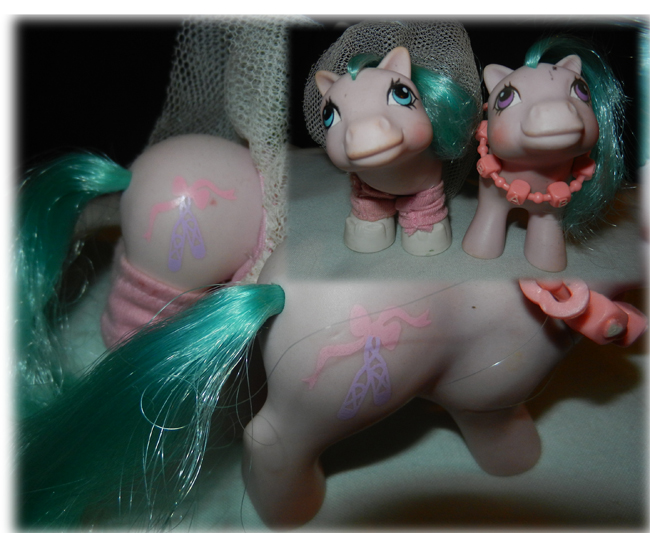 With BABY HALF NOTE: (Lavender baby pony with aqua mane and tail, lilac ballet slippers with a pink bow symbol)