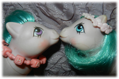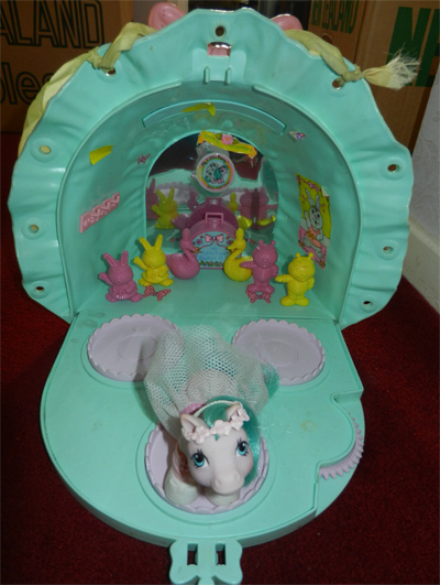 There is also a variation on the original theme - both of which came with the playset in the UK (since I had one and my friend had one, and so I know the full history of both ponies). My childhood pony had aqua eyes, curly hair and a lighter body tone than my friend's pony, who had purple eyes and straight hair.