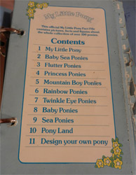 Offered in 1987 via this comic advertisment , the Fact File was a small blue binder which claimed to include "all" the little ponies in Ponyland. In truth the Fact File contained 125 ponies of various types - but did also omit the three UK adult sea ponies. Some ponies, such as Firefly, Moondancer and Powder appeared in the Fact File despite not being included in the UK pony issue, as they were prevalent in the comics of the time. Some ponies were misrepresented: Minty was shown in purple, for example, and Honeycomb with a horn, rather than wings.