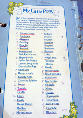 By far the biggest section in the file is the section simply entitled "My Little Pony". This contained an amalgamation of several sets, and some of the ponies included in it were not sold in the UK, despite being well known here (as I mentioned above). The ordering of the ponies in this file is neither alphabetical or chronological, though there is a bit of set-related logic involved in how they are arranged. For example, you can see where Hasbro thought Paradise, Lofty and Ribbon should fit in, even if they ultimately didn't. The latter half of the list is very jumbled, in my opinion!