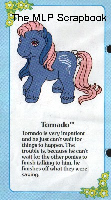 Because of it's status as Mail Order, I've also linked it from that section, but it really belongs here, in 1987, because there is an invisible dividing line in UK My Little Pony knowledge. Those ponies in the fact file (1987 and before) and those not (1987 and after). 1987 is a threshold year, in which much happened and many ponies came out. It has three separate inserts, but only the sets featured on the FIRST insert made the cut for the Fact File entry.