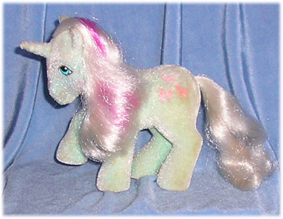 Fifi was originally depicted on her backcard without the horn or the pink streak in her mane - which should curl. She was never sold in the UK - in fact, until I came online in 97 for the first time, I had no idea that the multinational Baby Fifi was actually a derivative of an already sold adult pony. There was never a version of Fifi sold without the flocking - she only ever existed as part of this So Soft set.