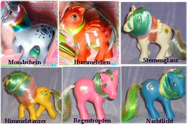 There were six characters in the 'German' release of the Rainbow Ponies. From Mondschein and Hümmelchen - who looked enough like the mainstream characters to be recogniseable to all - to Regentropfen and Nachtlicht, two entirely new personas.