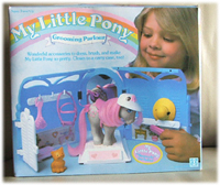 The box, I am told, has clearly been Hasbro-edited to show Snuzzle instead of Peachy, which would support this assumption. The insert with the playset is a 1986 one, though the Parlour on it features Peachy, and this would date the playset to the very end of 1986 or early 1987, before the 1987 insert was out. This would also be supported by the appearance of the name 'Storm' on the pony name cards - Storm being the original production name for the Mountain Boy Pony we better know as Thundercloud.