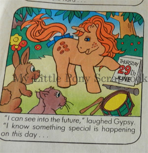 Gypsy is one of the more unique of the early My Little Ponies. Though she belongs in some senses with the other original Unicorns (such as Glory, Sparkler and Gusty), Gypsy stands out because she is the only one not to have the customary streak of colour in her mane. She also has freckles, a feature no other early unicorn pony shares.