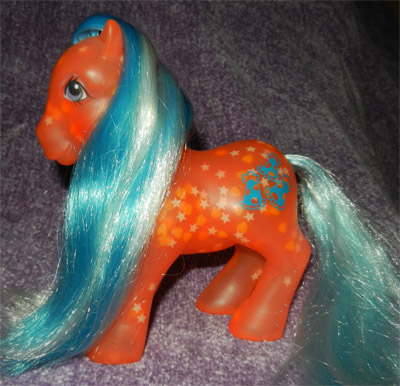 The pony shown at the top of the page is my sister's childhood Happyglow, which she got here in the UK, on UK backcard (which we still have), so I know 100% her provenance. As you can see from the picture, her body tone is fairly translucent, and the shade of blue in her hair is very clearly a blue, rather than an aqua blue. I am of the general opinion that most Happyglow ponies in the UK were, in fact, sold with this very blue shade in their mane, although without seeing every single one ever sold, it's hard to prove.