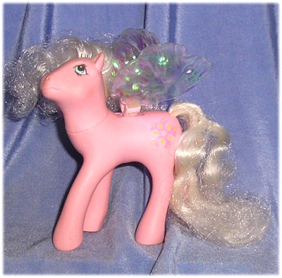 Pink flutter pony with pale pink mane and tail, pink and yellow honeysuckle symbol, irridescent wings (often missing).