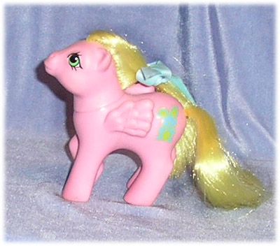 Pink baby pegasus with UNPAINTED first tooth, yellow mane and tail, yellow and blue rabbit symbol