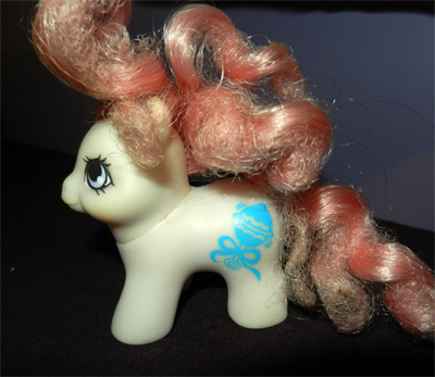 As you can see from the above comparison shot, it is not just the shade and texture of the hair that differs. The eyes are far more smudgily printed on my childhood pony, and her symbol is considerably more vivid a blue (rather than the pale baby blue on the fading pink baby). There is a faint body tone difference too, but this could be due to age and cannot be relied on.