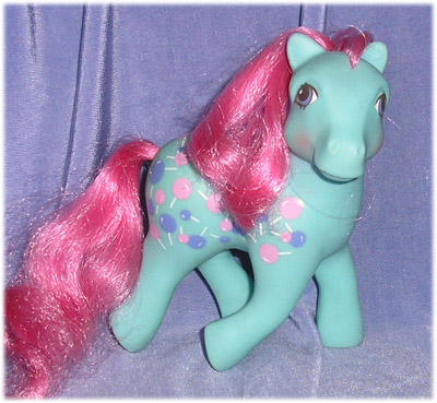 Lollipop was called Sweet Tooth in the North American release, though there are no variations between the pony sold there and here. She is meant to come with curls in her hair (my MOC German one has very curly hair), though our loose one (pictured above) has dropped quite a few of hers along the way! As with any curly haired pony, frizz or no curl are always common factors second hand.
