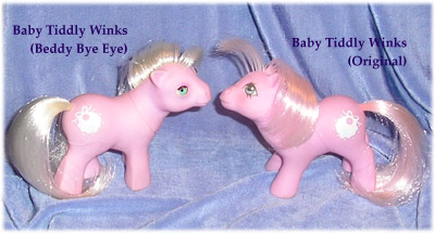 In the United Kingdom, the Lullabye Nursery was offered through till 1988-9 and for the whole time the baby pony sold with the set was the original edition baby, with normal style eyes and three white freckles on her nose. In the United States and Canada, sometime around 1986 the release changed to include a Beddy Bye Eyed version of baby Tiddly Winks. She was never sold in the UK, and had open and shut eyes to fit the new style of the time. She had also lost her freckles! Both babies are pictured below. Please note that Beddy Bye Eye Baby Tiddly Winks's hair has faded somewhat and should be the same pink as Original Baby Tiddly Winks's.