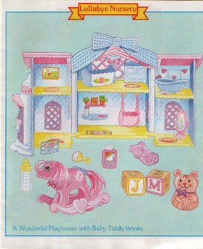 With an introduction of a whole set of Baby Ponies, it seems logical that they needed somewhere to live! The Lullabye Nursery was the solution - a nursery equipped with bathing, play and bed facilities that were all a baby pony could want. With this playset came a cheeky little baby pony, "Baby Tiddly Winks", who, by dint of her playset release, is one of the more common Baby Ponies from the early years. The above picture is taken from the UK insert, 1985.