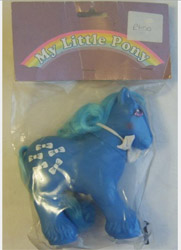 At the close of the line, some of the Mail Order Ponies surplus from the US did come across the Atlantic to be sold in oddly marked bags at market stalls and carboot sales. These were fastened at the top with a grey band of cardboard featuring a rainbow, but nothing else...and they were sold at cheap prices. So far, collectors here have found Twice as Fancy Baby Ponies, Tux and Tails and several Birthflower Ponies.