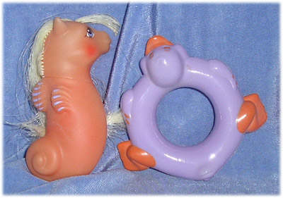 Orange baby sea pony with yellow mane, lavender fin paint. Purple and orange duck float.