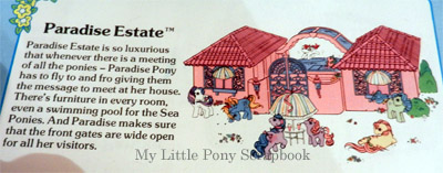 It's very clear that, at some point, Paradise was going to come with Paradise Estate. Not only the Hasbro catalogue, but also the insert for the year and the list Hasbro sent me mentions the playset "With Paradise Pony." The Fact File also includes Paradise, and its entry for Paradise Estate makes clear mention of her, indicating that she was originally going to come with the set. She can just be seen in the rear of the image, under the pool canopy.