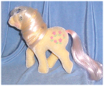 Posey would also see a release as a So Soft Pony. This pony had dark symbols, largely to show up through the flocking. Her hair was also pink (mine is a little faded!)