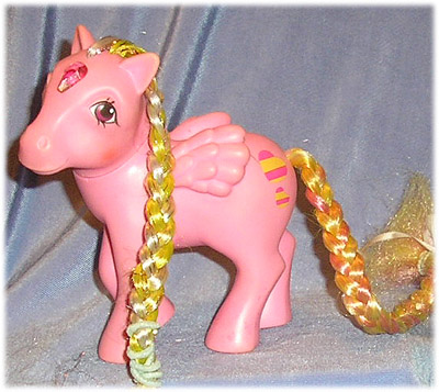 Pink pegasus pony with yellow, pink and dark pink mane and tail (dark pink tinsel in mane), pink and yellow striped hearts symbol, dark pink gem on forehead.