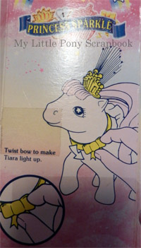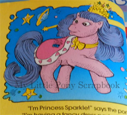Princess Sparkle was only sold in Europe/the UK/Australasia and was the ultimate gimmick pony from 1993. She did make a brief appearance in one of the pony comic stories , as part of one of Sweetheart's dreams, where she helped Sweetheart get all dressed up. She was pretty faithfully represented. Her backcard story had something to do with getting ready for a party to which the Seven Characters were invited. She was sold with a glittering star pick like the ones sold with earlier Princess ponies.
