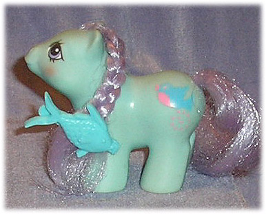 PEEKS: Blue earth newborn with lavender mane and tail, pink and blue bird symbol.FRONT RIGHT HOOF RAISED UP OFF THE GROUND.