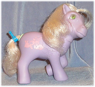 Purple with pale pink mane and tail, two pink rabbits symbol, aqua ring round tail.