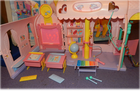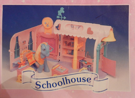The My Little Pony Schoolhouse was one of two playset buildings released after My Little Pony in the US had begun to fold, and so was never sold over there. The Schoolhouse is most famous internationally for being the school attended by the Seven Characters in the MLP Tales series, but it was originally issued before they were even thought of.