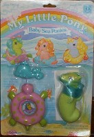 Sea Shimmer had a second edition the following year as one of the Pretty N Pearly Baby Sea Ponies. HOWEVER she was only sold in this form in the North American set. She was not part of the UK release of Pretty N Pearly Baby Sea Ponies. Her float remained the same, though the baby pony now had a pearly sheen to her body.