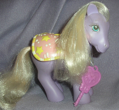 Shinig Secret was a "star" Secret Surprise Pony, in that the white in her eye was a star shape (you can just see this in the picture) and her cape had a star design. She came with a bracelet treasure.
