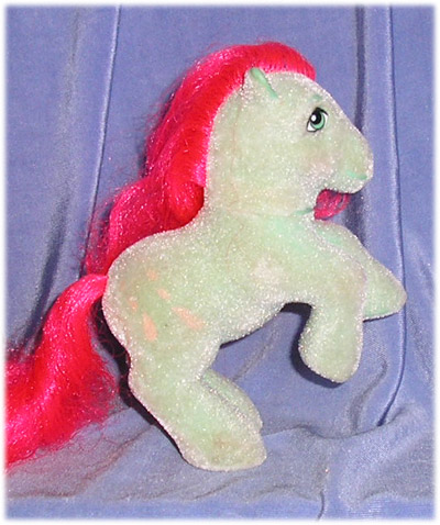 Spookily, though Skippety Doo was never sold in the UK or as anything other than a So Soft Pony, there is a later UK/European issue pony who bears a startling resemblance to her. Playtime is an earth pony from the Schooltime Pony range, in aqua with dark pink hair. She has a skipping rope for her symbol. Was this an attempt by Hasbro in Europe, several years on, to compensate for the lack of the original in our stores? We will never know. But the likeness is too close to be a bare coincidence...