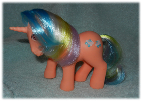 Speedy is a complex character. Cast as the energetic, fun-loving, adrenalin junkie that loved to skate her way around ponyland, it isn't just her fellow ponies that she wound up giving a headache! Though Speedy was released in every country that Twinkle Eyes were sold in, she seems to have multiple editions. Firstly, we know for sure that in North America she was first sold as part of the three new characters in the early 1986 set. Then she was pulled over to be a sixth wheel in the 1987 set with five new characters. In the UK, she was sold as part of a set including Sky Rocket, Tic Tac Toe, Locket, Fizzy and Sweetie. And in Europe she seems to have been sold in two colours - the more common salmon and the paler colour, as shown below.