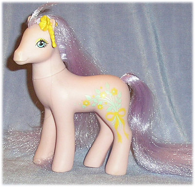 Lavender earth pony 'sister style' with lavender mane and tail, bouquet of yellow flowers symbol, yellow floral earring.