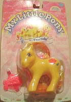 As can be seen from the pictures below, the ponies were sold on seperate cards and though their accessories did follow a theme, they were by no means identical. For example, Baby Sunbright's ribbon is lurid orange and her mother's is dark magenta, while Daddy Sunbright has an orange fish comb and a green ribbon.
