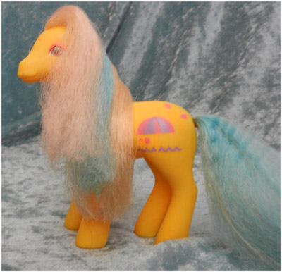 Yellow sweetheart sister pony (no pierced ear) with white (colourchange to magenta in sunlight), blue and blond (!) mane and tail, dark pink and purple parasol over the seal and hearts symbol.