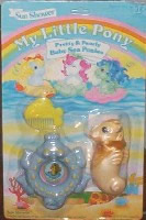 Sunshower was another of the new characters introduced to the Sea Pony line this year. She was sold in both North America and the UK, but her pose differed between countries - UK version above (from my childhood, so I'm sure on this, LOL) and North American version shown below. The float seems to have been the same between the two sets, however, which seems to have been true of all the alternate pose baby sea ponies.