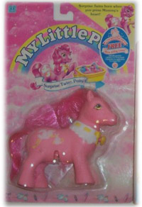 Surprise Twins Pony doesn't really have a name, and nor do her twins. She is generally known as "Mummy Pony" but that's not really a name, either. The babies are really easy to lose and so super rare on the second hand market - in fact, practically impossible on their own. They are the smallest baby ponies in the whole pony line.