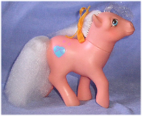 Salmon earth pony with poofy white mane and tail, blue heart sachet symbol, scented.