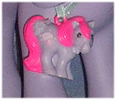 Obviously, considering how hard to find the pony is, finding the charm is about a hundred times more difficult (and so is finding the proper cord she was originally sold with - please note that the ribbon in Sweet Scoops' tail is original to the pony, but the blue one round her neck with the charm on it is NOT. The real cord is pink, I believe - but I have never seen one in real life.)