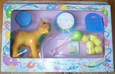 The European release of the Birthday Party set was a bit of a cheat after the pony-loaded release of the set in the North American line the year before. Though the basic accessories between this set and the North American one are the same, instead of five ponies there was only one - a brand new character called "Tutti Frutti" who was only ever sold as part of this playset. She was an earthling - despite having the coloured streak in her hair - and there are two variations, for her streak of hair can be rooted on either side of her mane.